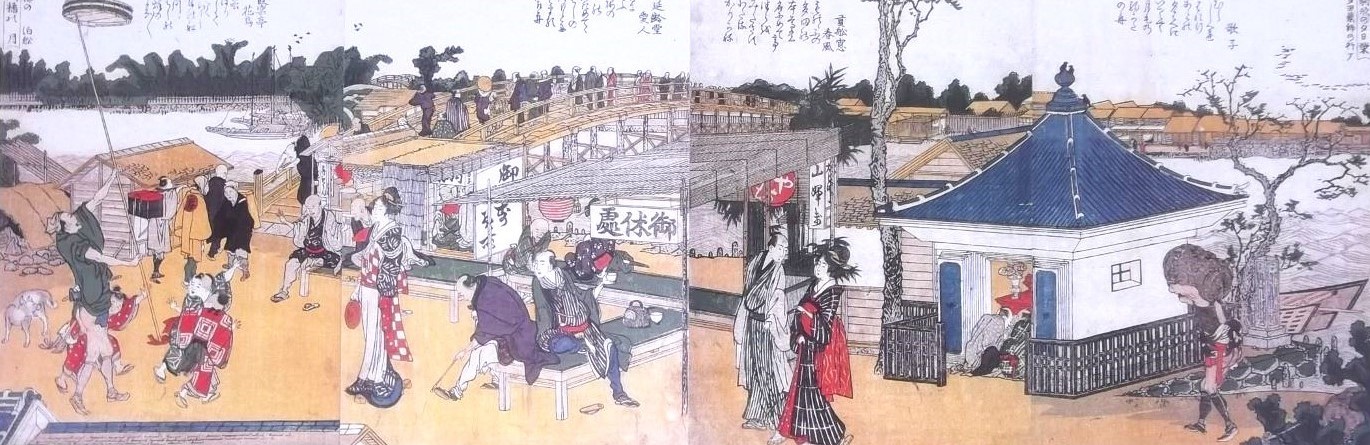 | 駒形堂と吾妻橋広小路の賑わい 橋対岸左は向嶋小梅の舟泊と北十間川にかかる源兵衛橋、水戸殿下屋敷緑樹を経て桜並木へ 吾妻橋対岸右は両国橋へ続く遊歩道と多田薬師方向の行雁 『北斎の狂歌絵本 』 「絵本隅田川両岸一覧」 永田生慈監修解説 朝倉治彦解読 岩崎美術社刊 1988 より転載 江戸切絵図16 本所絵図 い・ろ壱・弐 / 江戸切絵図17 浅草御蔵前辺図 い3 / 江戸切絵図27 隅田川向嶋絵図 い1 |