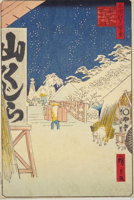 | 上の図は尾張屋の江戸切絵図と同時期に販売された広重『名所江戸百景』から冬景4点を拾いました。 『名所江戸百景』安政3~5年 国立国会図書館蔵 錦絵デジタルコレクション NDLサーチより転載 |