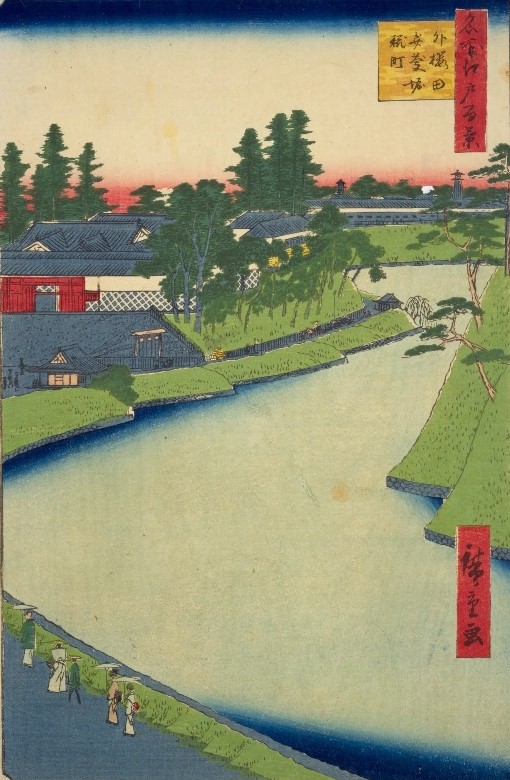 |  参考図1 外桜田弁慶堀糀町 広重 安政3年(1856) 弁慶堀は現桜田堀、左の屋敷は 井伊直弼上屋敷、現警視庁近辺 江戸切絵図7 外桜田永田町絵図 |  参考図2 神田紺屋町 広重 安政4年(1857) 白地に魚は版元の魚栄、ヒとロを 組合わせた広重紋の布地が秋風に 江戸切絵図3 日本橋北神田絵図 | 尾張屋板のすべて 江戸切絵図 全32図 画像一覧 岩橋美術 |  参考図3 増上寺赤羽根 広重 安政4年(1857) 二代将軍秀忠の5階建て御霊屋 赤羽橋と久留米藩有馬家上屋敷 江戸切絵図4 芝愛宕下絵図 |  参考図4 小梅堤 広重 安政4年(1857) 稲干しを終えた榛の木が列ぶ田圃 晩秋の引舟川、八反目橋には冬姿 江戸切絵図9 隅田川向嶋絵図 |